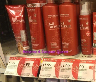 Here is a new $1.50 off any One John Frieda Full Repair Product coupon and we have a gift card deal at Target to go along with it. Buy 3 of them and get a $5 gift card back. This deal runs 9/29. You can print 2 coupons per computer so you are going to need access to 2 computers to do this. Here are the details: